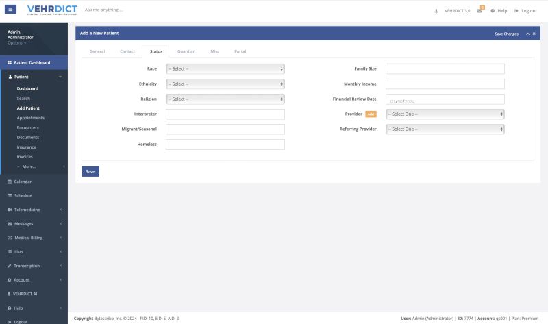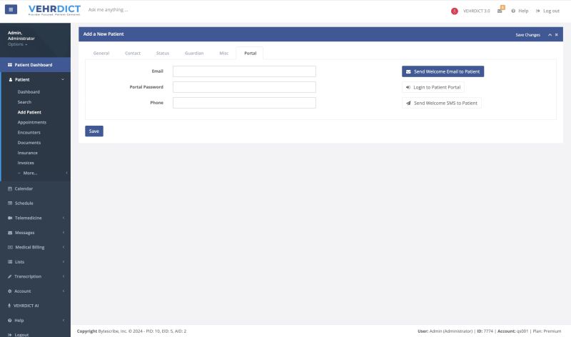 VEHRDICT's simple and intuitive interface makes it easy to quickly add and edit patient information either through manual entry or using the dictation AI feature in the toolbar. Select the Add Patient tab listed under Patient Dashboard. Then fill out the appropriate fields and click "Save Changes" when finished.