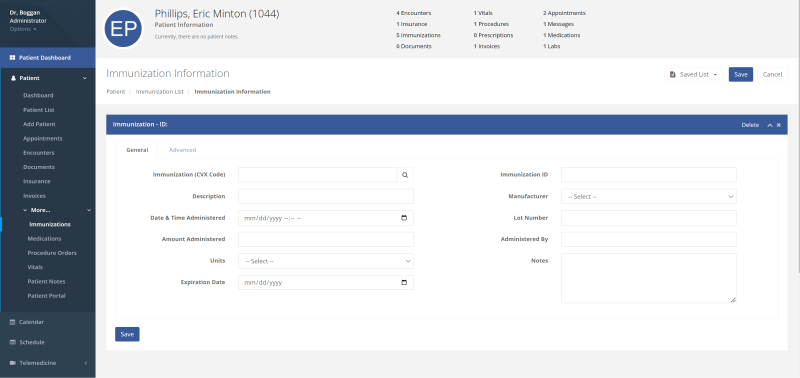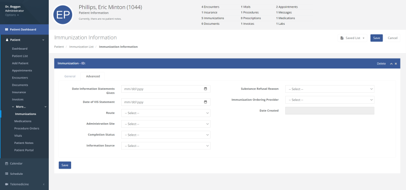 By selecting the "Advanced" tab, the user can add even more information about the immunization like the Route, Administration Site, if the patient refused, and more below.