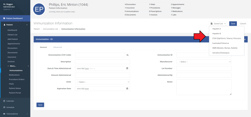 Thirdly, by clicking on the icon box stating "Saved Lists", this box highlighted by the red arrow appears, Allowing you to pick the most common immunization, which you can quickly edit, this allows user a jumpstart to select an immunization.