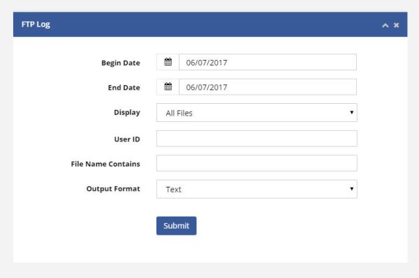 From within the FTP Audit Trail window, log files can be generated using the drop down field next to Daily Log File. A search feature is also available in the File Name Contains field. The user has the option to include header files in the report by selecting the checkbox at the bottom of the window. | From within the FTP Audit Trail window, log files can be generated using the drop down field next to Daily Log File. A search feature is also available in the File Name Contains field. The user has the option to include header files in the report by selecting the checkbox at the bottom of the window. | ||