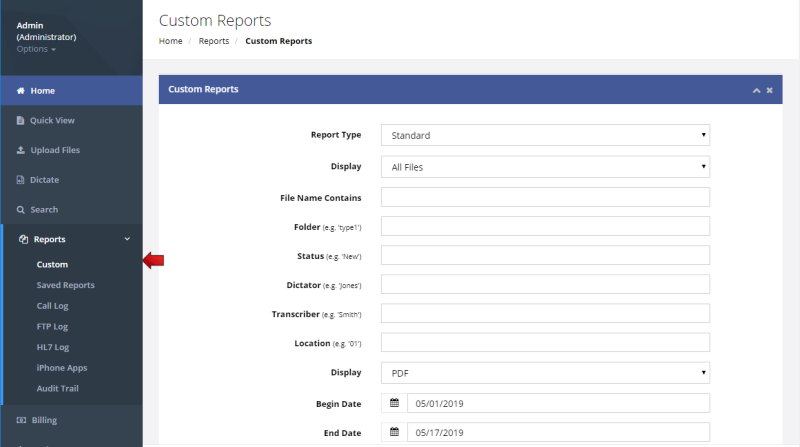 Created page with "WebShuttle can create various types of custom reports. To create reports, select the Reports | Custom Reports menu option from WebShuttle. Enter the desired criteria into the Custom Reports window to run the report. The user can select the output format to be PDF, text file or Excel CSV format. Administrators can run billing reports based on line counts. 800px ==Dictation Call Log== For any WebShuttle accounts using the call-in dictation..." |
