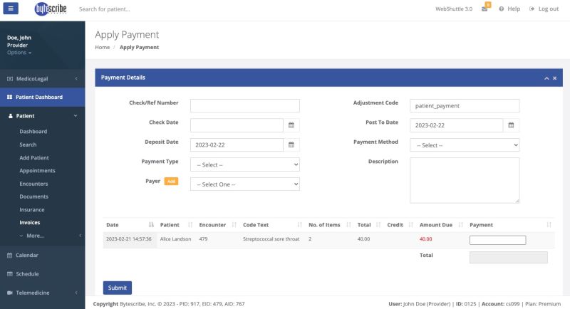 To apply a payment, simply select the "Apply Payment" button and fill in the necessary information, being sure to select insurance if the patient has it.