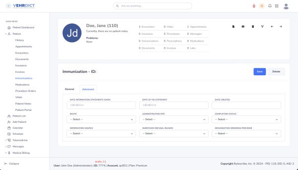 The Patient Immunizations page in VEHRDICT is a powerful, user-friendly tool for tracking, updating, and reviewing a patient’s full vaccination history. Each entry includes essential details such as vaccine type, dosage, date, and provider information. The system proactively alerts providers about upcoming vaccines and booster requirements, helping to maintain full schedule compliance.