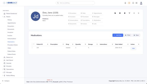 - Prescription List: Contains only medications prescribed by the logged-in healthcare provider through VEHRDICT.