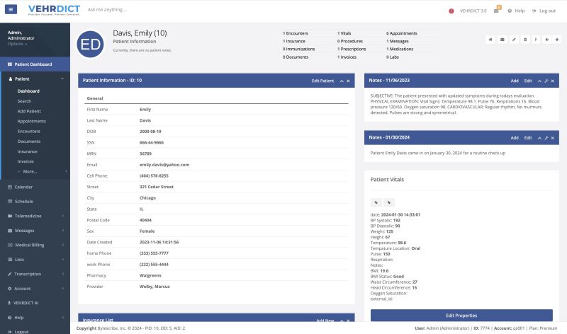 The VEHRDICT EHR patient dashboard is designed for optimal user experience, presenting all essential patient information in a single, consolidated view. It features dedicated sections for encounters, appointments, insurance details, prescriptions, immunizations, documents, invoices, and lab results, each | The VEHRDICT EHR patient dashboard is designed for optimal user experience, presenting all essential patient information in a single, consolidated view. It features dedicated sections for encounters, appointments, insurance details, prescriptions, immunizations, documents, invoices, and lab results, each organized for quick access. The layout ensures that everything is displayed in a clear, orderly fashion, enhancing the ease of information retrieval. Additionally, the intuitive left-side menu facilitates smooth navigation across different sections of the Electronic Health Record, streamlining the user's journey through various healthcare data points. This design not only improves efficiency but also enhances the overall user interaction with the EHR system. | ||
