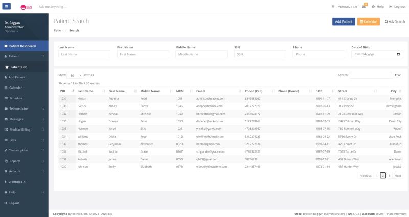Welcome to Vehrdict's Patient Search support page. The Patient Search feature revolutionizes the process of accessing patient information with its streamlined and intuitive interface. Users can effortlessly navigate through patient records by entering various search criteria such as last name, first name, date of birth, social security number, or phone number into the designated fields. This user-friendly design ensures that essential patient details are readily accessible, significantly enhancing the efficiency of users tasked with managing patient records and appointments.