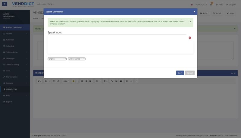 VEHRDICT AI simplifies interaction with its voice command feature. By clicking the microphone icon on the top toolbar, users can activate the AI window and issue commands through speech. This hands-free convenience allows users to instruct the AI to navigate the site, edit information, perform dictation, and access a wide range of functionalities. After giving a command, users can either verbally say "do it" or click the 'Do It' button in the bottom right corner to initiate the action. This feature ensures an efficient and user-friendly experience, harnessing the full power of AI to serve the user's needs.