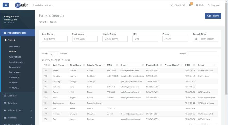 The search functionality is seamlessly integrated into every WebShuttle portal page, placing the search bar conveniently at the top for easy access. Users can initiate a search by inputting any relevant criteria, whether it's the patient's first name, last name, date of birth, or social security number. For more refined searches, users can opt for the advanced search option available under Patient | Search in the WebShuttle EHR menu. Within the Patient Search page, users can further tailor their searches by including additional criteria such as middle name, phone number, or social security number. Search results are promptly displayed, and users can fine-tune their queries using the search box located in the top-right corner of the results section, ensuring swift and precise retrieval of patient information.