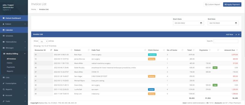 Information for each patient encounter is used for medical billing. The DX (condition of the patient) and CPT (service rendered to the patient) are used when generating proper medical codes for billing. ICD-10 and CPT codes can easily be extracted from the patient encounter and entered into an invoice used for medical billing. The coding information is used to generate HCFA 1500 (CMS 1500) forms for insurance submission or the information can be submitted electronically through EDI (Electronic Data Interchange) to a medical billing clearinghouse. WebShuttle will guide you through the medical billing process with tools and reminders that make it easy.