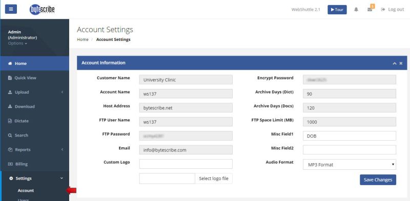The Account Information section of the settings windows includes the FTP settings for the WebShuttle account. When using DocShuttle software, you will need these FTP settings in order to connect to the WebShuttle FTP site. The Account Information section also includes settings for purging files from your account. Document files and dictation files are purged based on these settings. By default, document files are purged after 120 days and dictation files are purged after 14 days.
