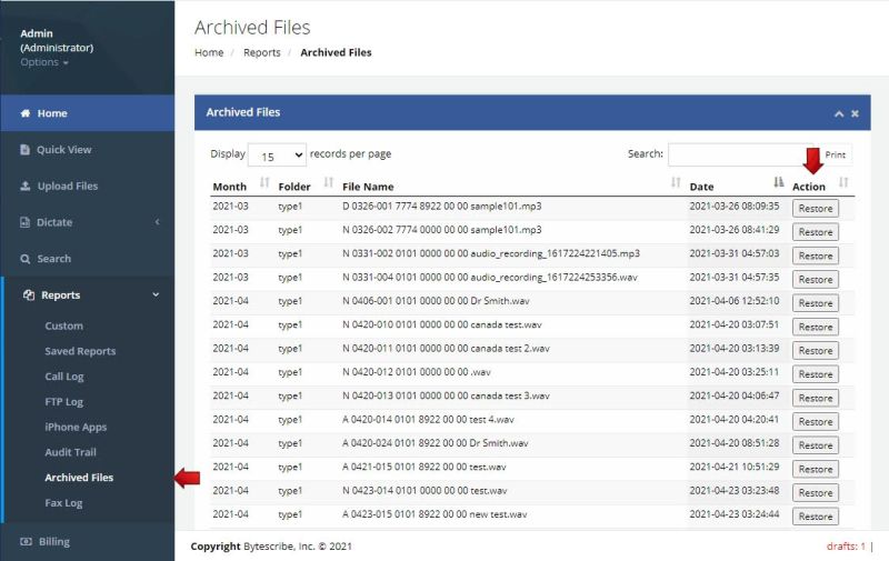 Log into your administrator account and click the "Reports" tab, then click "Archived Files".
