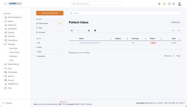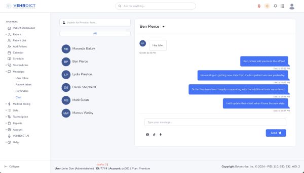 Vehrdict offers a secure messaging system that streamlines communication between providers, staff, and patients. Through the Messages tab and the Patient Portal, patients can directly engage with their healthcare team. Notifications for new messages are clearly shown in the Vehrdict interface to ensure timely, confidential communication.