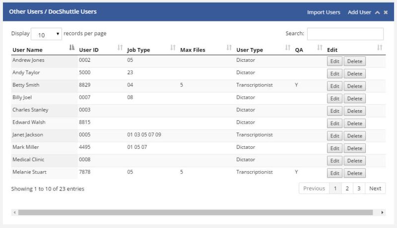 Users that will accessing WebShuttle using DocShuttle software must be set up as DocShuttle Users. Any dictator or transcriptionist who will be dictating or transcribing should be included in this list, even if they won't be using DocShuttle. The DocShuttle Users list includes the names that appear on the WebShuttle home page.