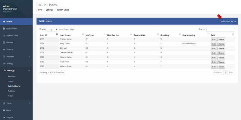 To view a listing of the call-in users, select Account | Dictation Users from the WebShuttle menu. This listing shows all users that have been set up to dictate using the WebShuttle call-in dictation system. Each user that will be using a telephone to call in dictation must be set up with a call-in ID.