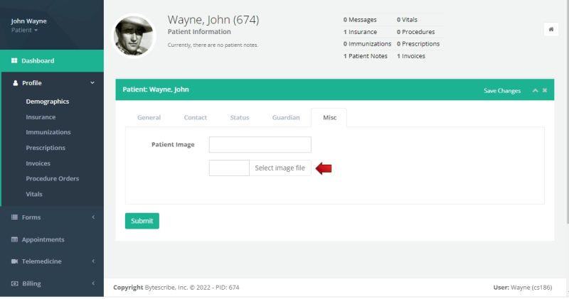 To add or change your profile picture, click Profile > Demographics > Edit Patient > Misc. Make sure you have the picture you plan to upload to your account on your device. Click Select image file then select a picture from your device to upload and click Open. Click Save Changes to make sure your picture uploads to your profile.