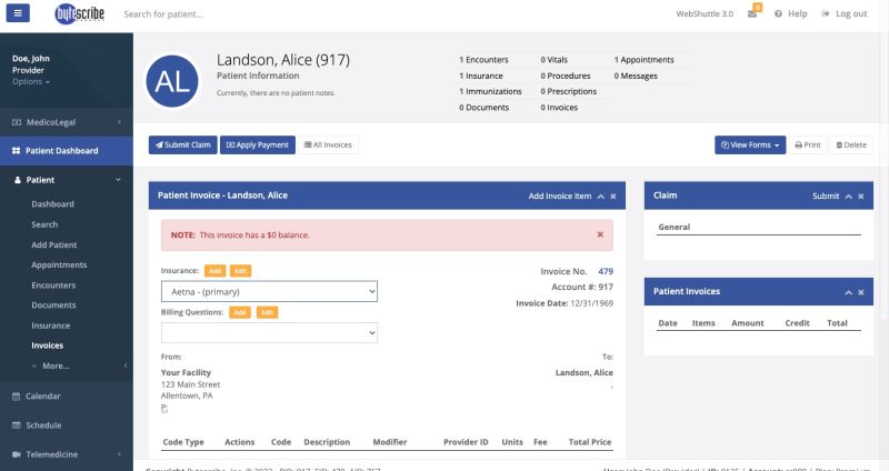 To be able to create an invoice, you must have something you are charging for in the first place, which will be a doctor's visit, or an '''Encounter'''. Refer to the '''Encounter''' section under the Patient Overview tab for a refresher on how to create an encounter. | To be able to create an invoice, you must have something you are charging for in the first place, which will be a doctor's visit, or an '''Encounter'''. Refer to the '''Encounter''' section under the Patient Overview tab for a refresher on how to create an encounter. | ||