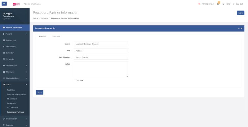 On this page you can enter details of the procedure partner like "Name", "NPI", "Lab Director" and more. You will also see two tabs at the top left. Labeled "General" and "Interface", the "General" tab is the one previously mentioned. The "Interface" tab allows you to input data that allows you to directly connect to the appropriate procedure partner.