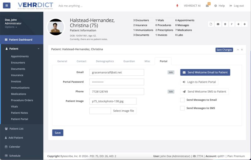 In the Patient Portal tab within the VEHRDICT system, patients are provided with a secure and private access point to their health records. They can view personal health information, exchange messages with their healthcare providers, and schedule or manage upcoming appointments. It's an essential tool for enhancing patient engagement and streamlining communication.