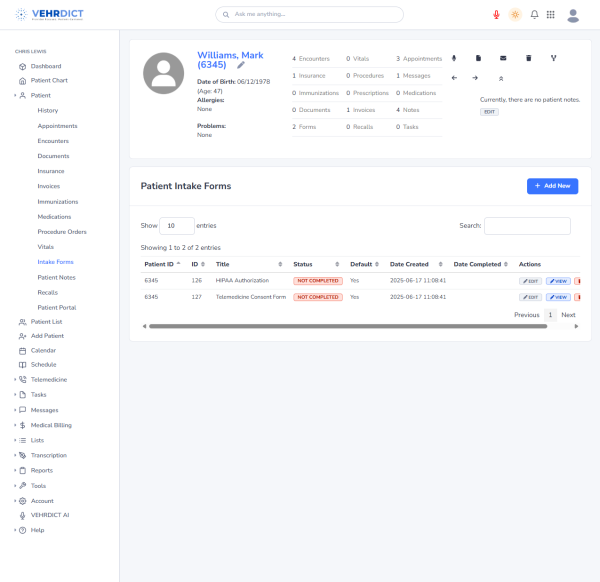 This guide explains how to manage, assign, edit, and review patient intake forms in the VEHRDICT platform. Intake forms are essential for collecting patient data before and during visits. This workflow is for physicians and clinical staff and covers how to assign forms, track completion, edit or delete forms, and follow best practices.