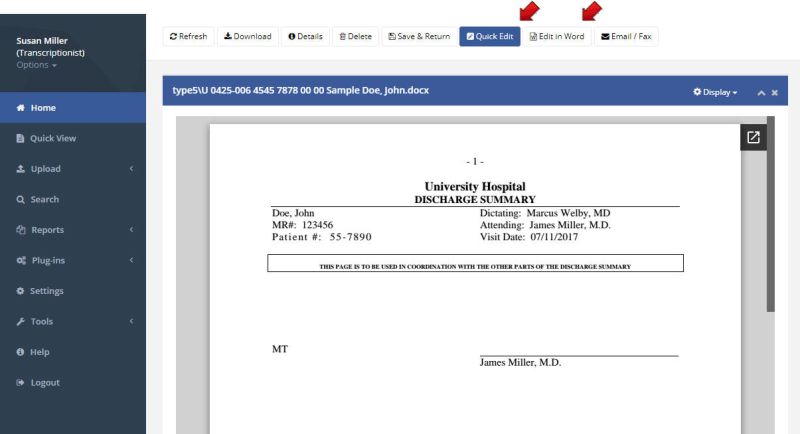 If Microsoft Word is installed on your computer, the user can select Edit in Word to transcribe documents. This will automatically launch the template in Word.