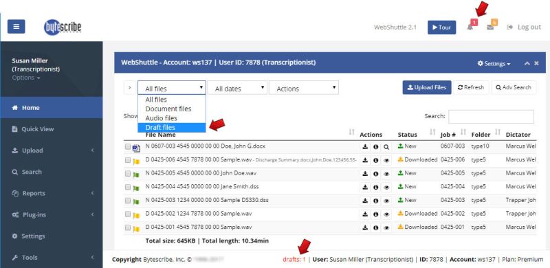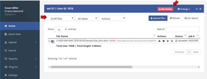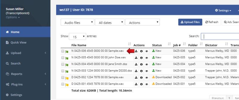 To transcribe files online, find the file you wish to transcribe in the Home page and click on the file name link as shown below.