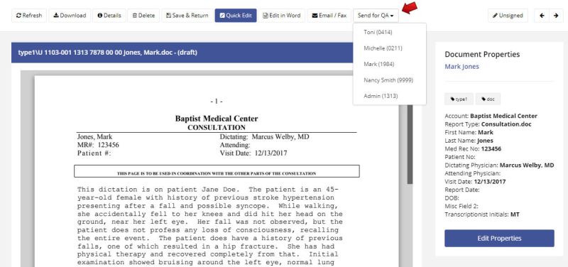 New documents can be sent to another WebShuttle user for Quality Assurance by clicking on the "Send for QA" button. Clicking this button will display a list other users that have QA permissions. Select the user from the list to send the document for QA.