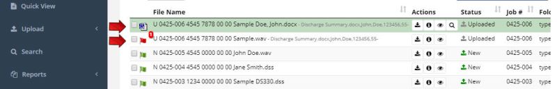 Once a document has been transcribed and saved, it will appear in the list on the Home page. The original audio file will be marked with a red flag and will have a notification bubble showing 1 attachment. The completed document is shown below with the Word icon. The document has a similar file name to the audio file.