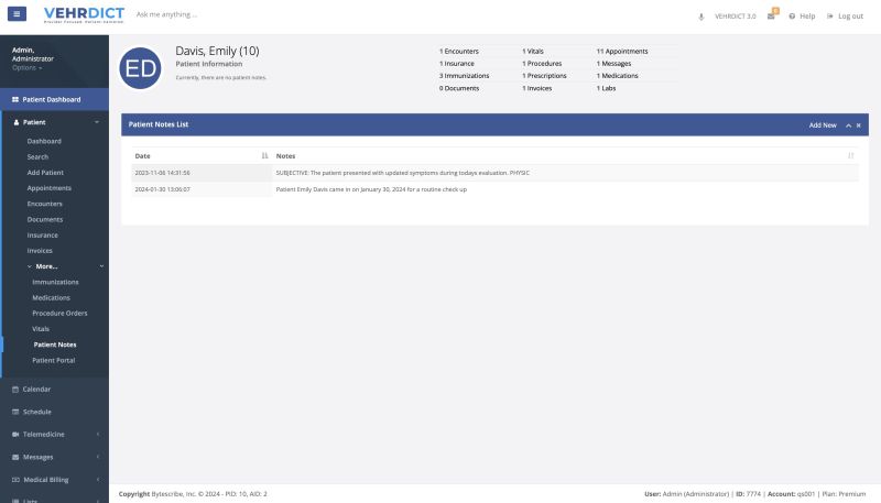 From the Patient Notes List, you can view existing notes or click Add New to document new observations and treatment plans.