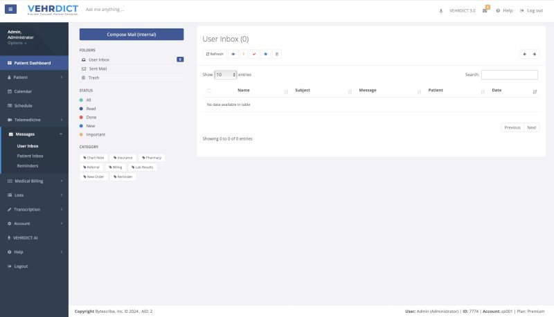 The User Inbox feature acts as a personal inbox for users, allowing providers and staff to receive and manage internal messages. It's a centralized location for all communication within the Vehrdict system specifically for the medical professional.
