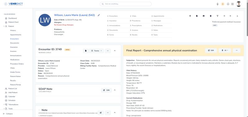 The EHR’s AI capabilities further elevate the documentation process by automatically organizing the collected information into a polished, professional report. VEHRDICT formats each document according to medical standards and best practices, ensuring it is ready for patient communication, internal use, or audits. Beyond formatting, the AI acts as a clinical guide—prompting the physician to include necessary elements required for regulatory compliance, insurance audits, and quality reporting. This helps maintain high documentation standards while reducing the administrative burden on clinicians.