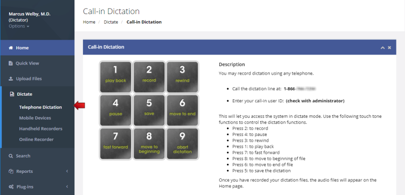 Users of WebShuttle can record dictation through the use of any telephone. Each account is assigned a telephone number for telephone dictation. Instructions and details can be seen for dictators by clicking the "Dictate | Telephone Dictation" menu option from the WebShuttle menu.