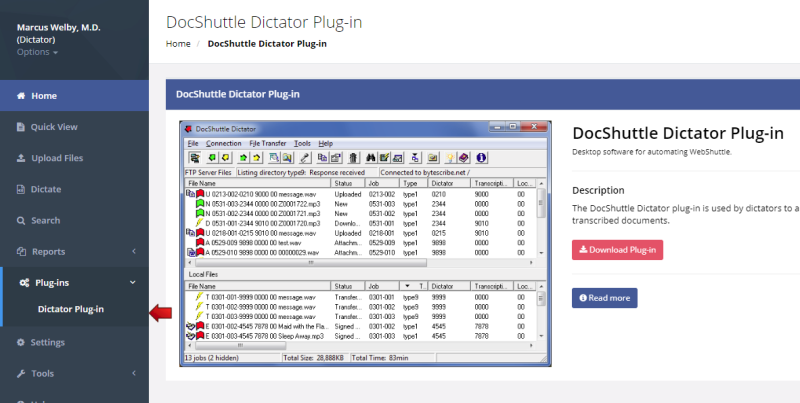 DocShuttle Dictator Plug-in is a modified version of the DocShuttle Dictator software by Bytescribe. This program can be used for features such as automatic importing and uploading from handheld recorders, automatic downloading and printing of documents and recording audio files using a microphone.