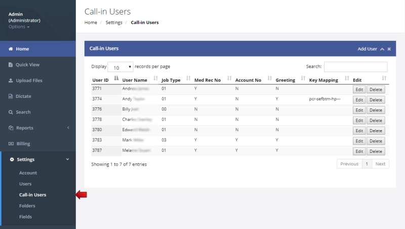The Administrator of the WebShuttle account will need to create call-in users and assign a 4-digit ID to each user.