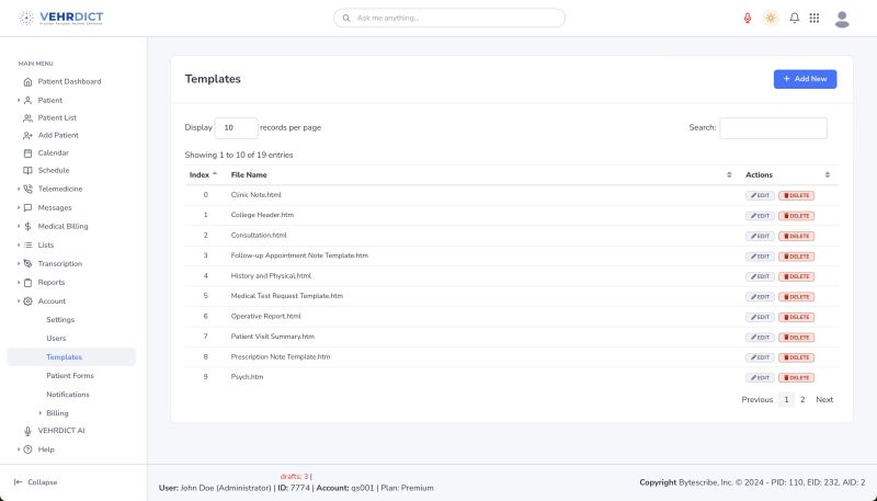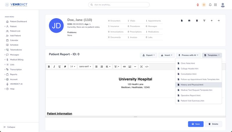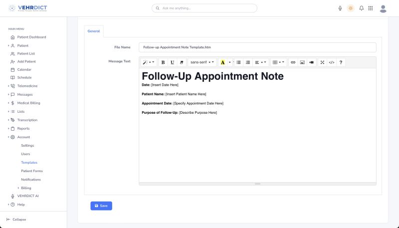 In VEHRDICT, templates can be used for creating clinical documents, encounter notes, emails, and SMS text messages. This powerful feature enhances consistency, saves time, and reduces manual data entry during patient interactions and administrative tasks.